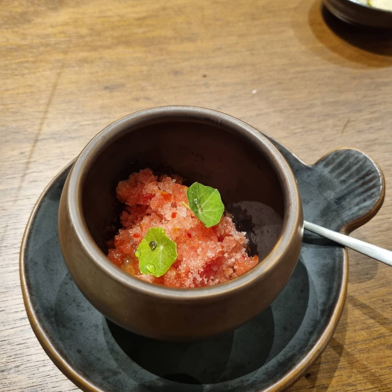 디저트로 주신 샤베트?인데 고추가 들어가서 알싸한 느낌도 있고 과일의 상큼함도 있는게 재밌고 맛있었다.